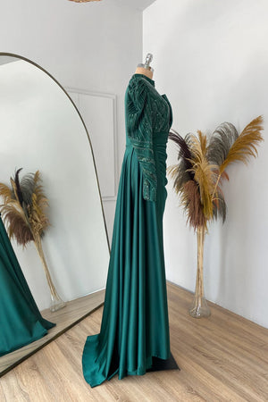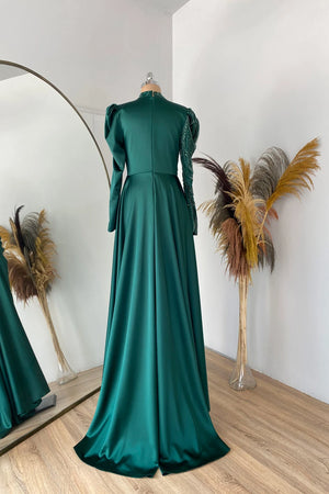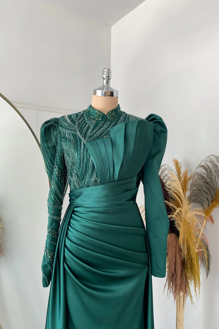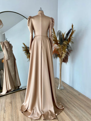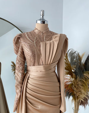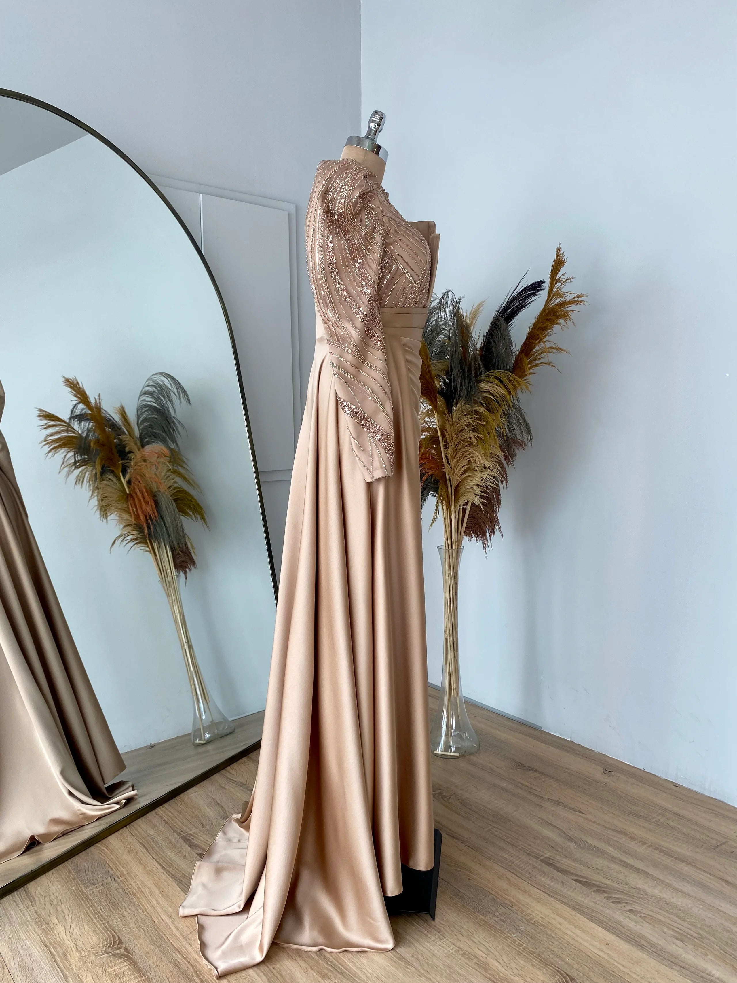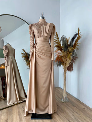 Abiyenin üst kısmı boncuklu dantel kaplamadır beli drapelidir göğüs kısmında ayrı bir drape bulunmaktadır sağ kolu boncuklu dantelle kaplanmıştır eteiğin ön kısmı pilelidir.bel kısmında montelenmiş sarkaç bulunmaktadır arka sırt kısmı gizli fermuarlıdır abiyenin boyu 155-160 cm dir.