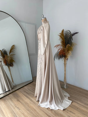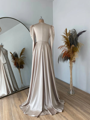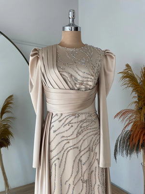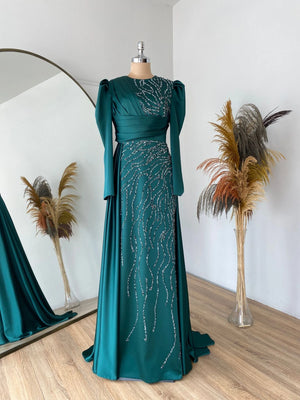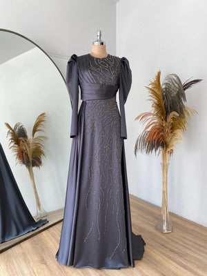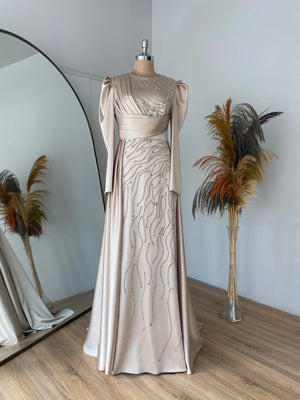Abiyemiz birinci sınıf saten kumaş kullanılmıştır abiyenin ön kısmı taş baskı yapılmıştır bel ve göğüs kısmında drape bulunmaktadır eteğin arka kısmında montelenmiş kuyruklu sarkaç vardır abiyenin içi komple astarlıdır arka sırt kısmında gizli fermuar bulunmaktadır.