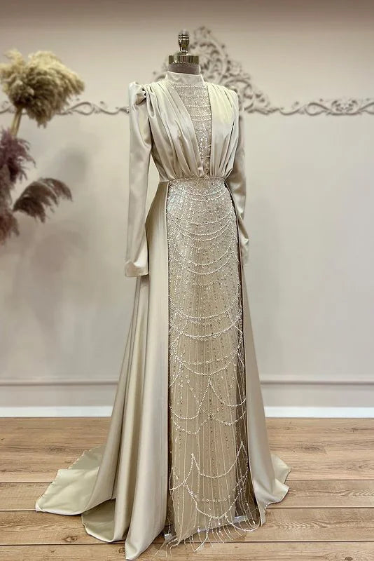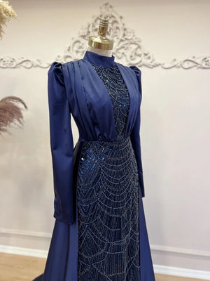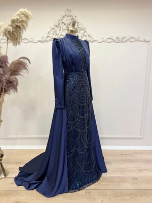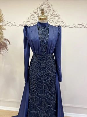 Abiyenin üst bölümü drape detayı bulunmaktadır etek kısmı işlemeli boncuklu dantel kullanılmıştır