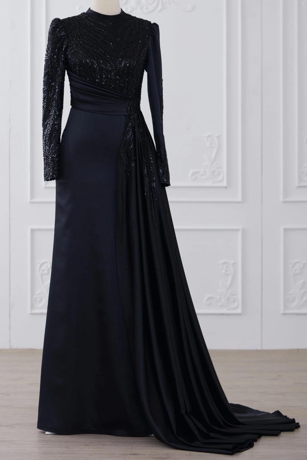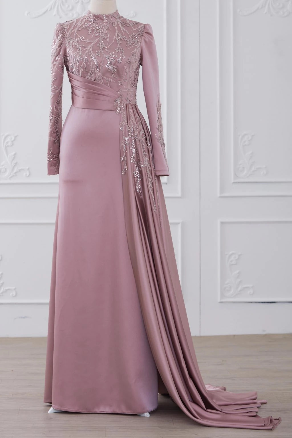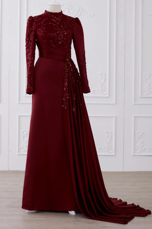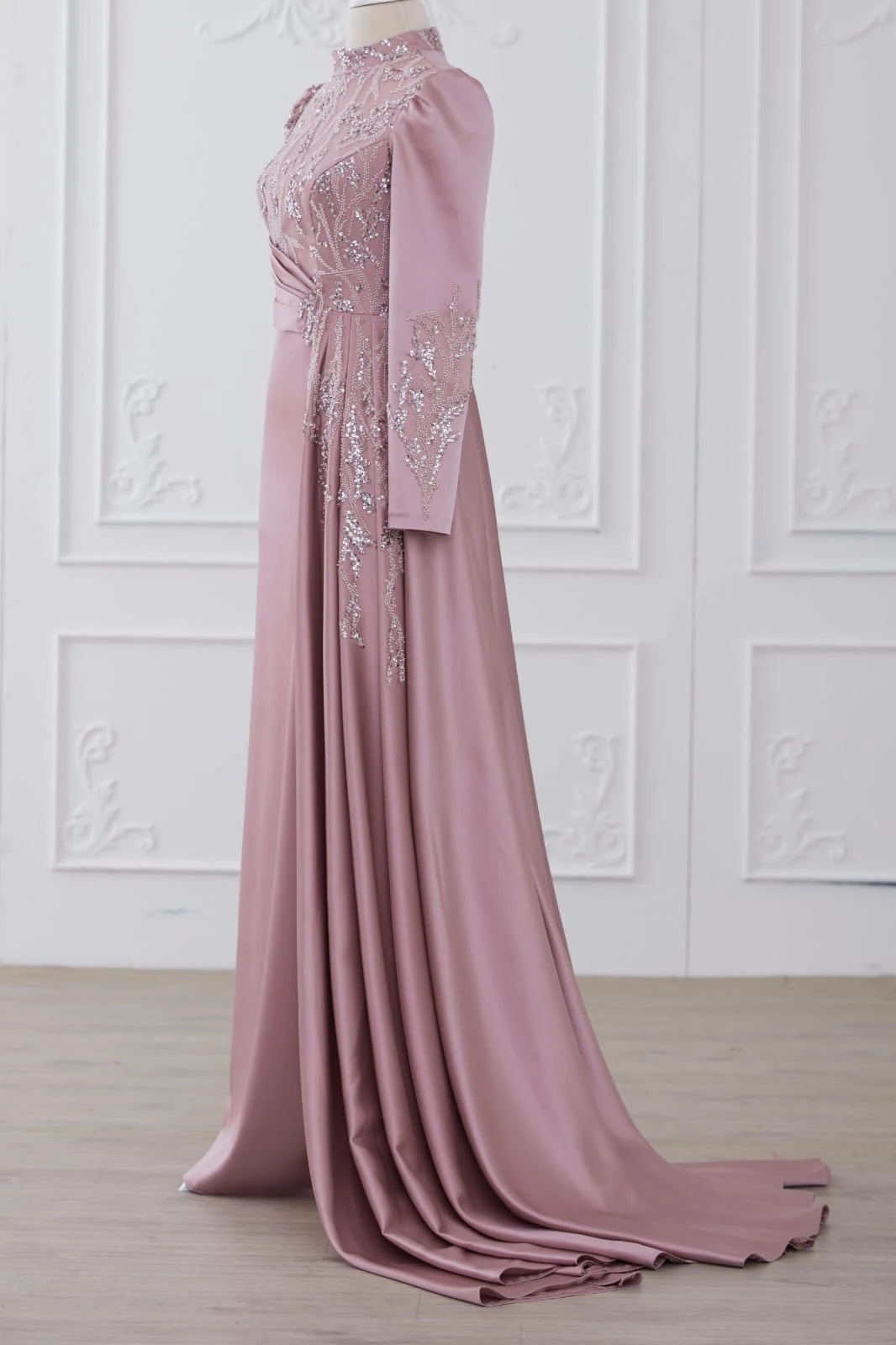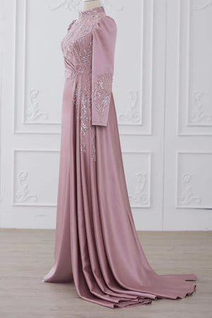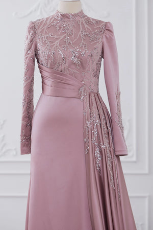 Abiyemizin üst kısmı boncuk işlemeli dantel kaplamadır etek ve arka kısmı birinci sınıf saten kumaş kullanılmıştır belinde demonte etek vardır arka kısmında gizli fermuar vardır abiyenin boyu 155-160 cm dir.
