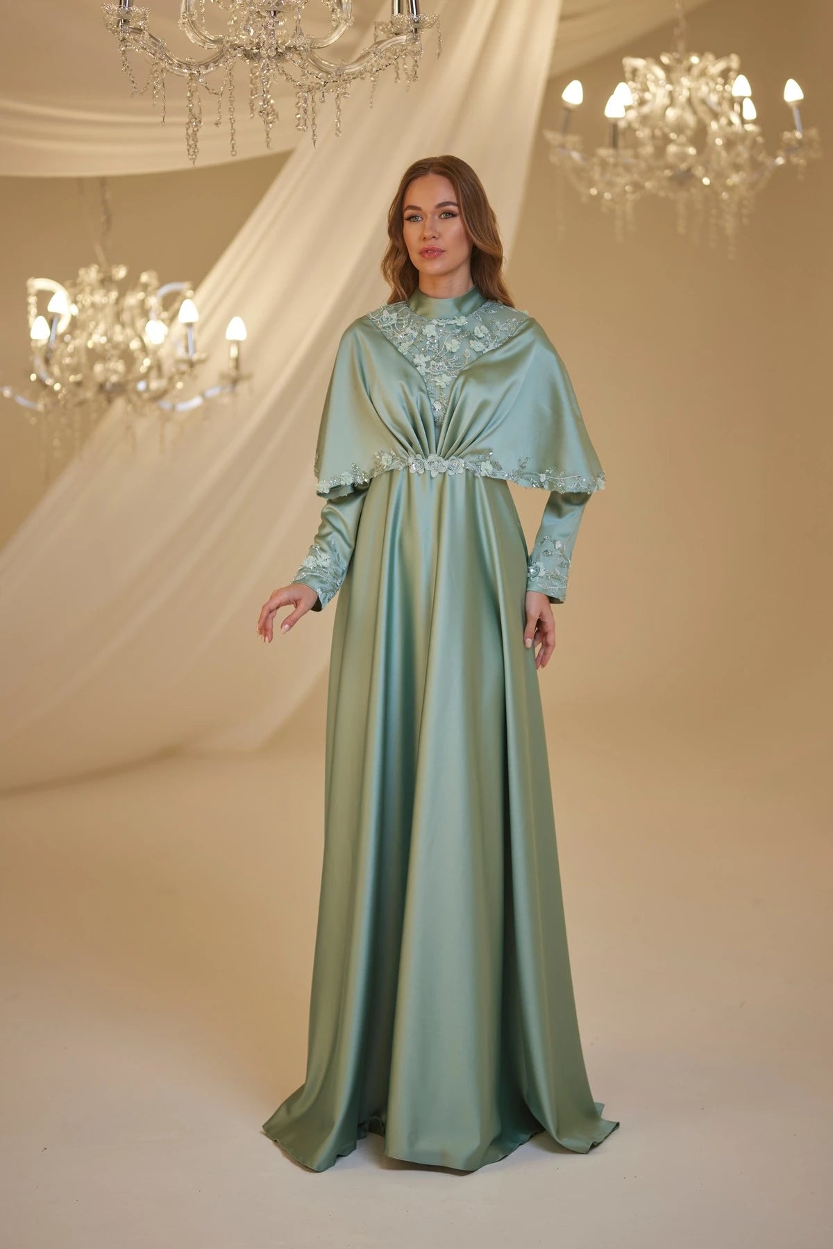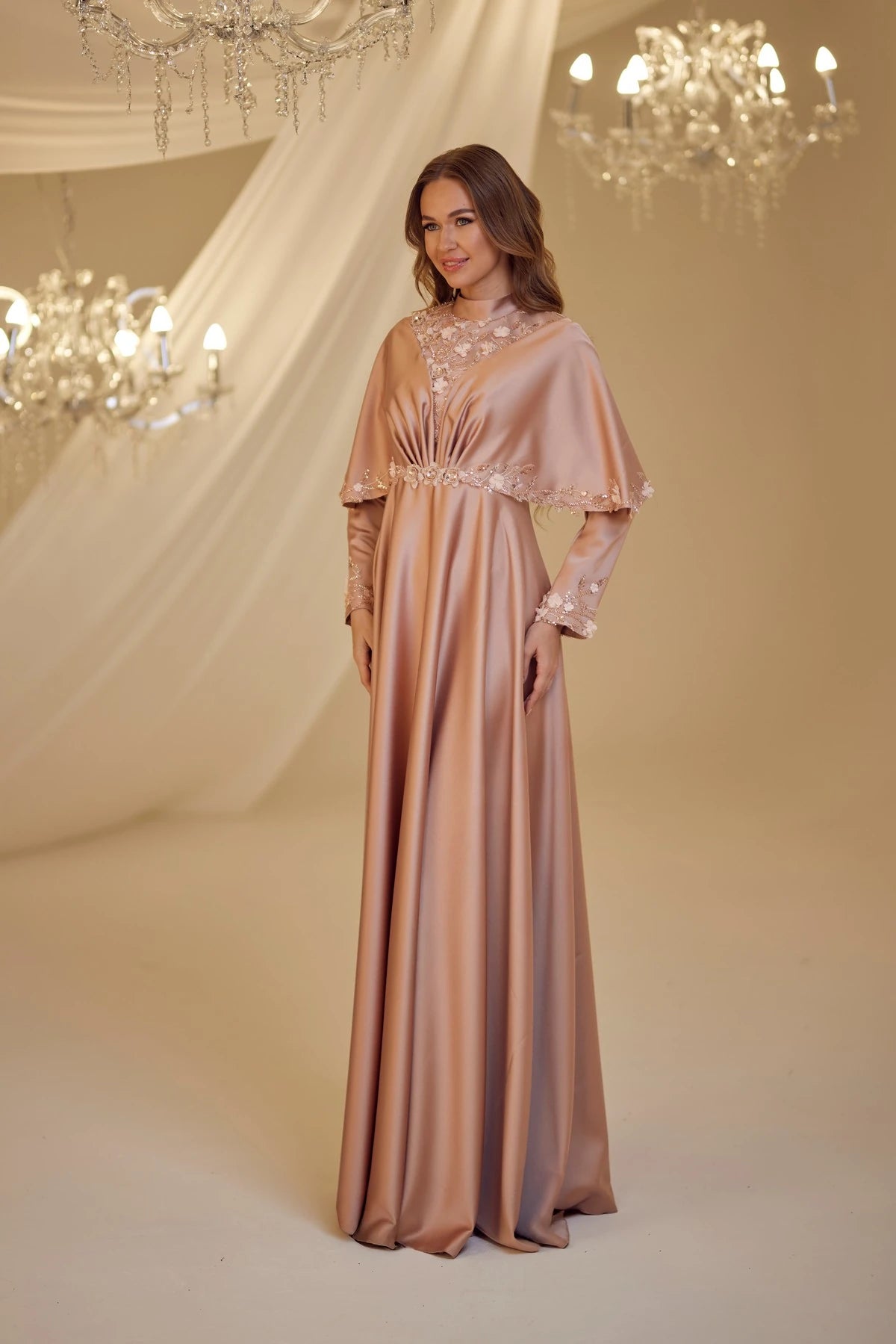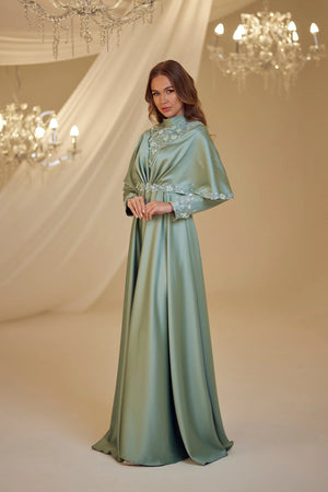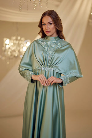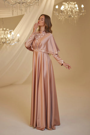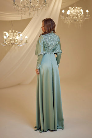 • Omuzlarından aşağıya doğru sarkan saten kumaştan yapılmış ve uçları ince dantel motiflerle süslenmiş gülşah abiye modelimiz arkadan gizli fermuarlı olup astarlıdır.