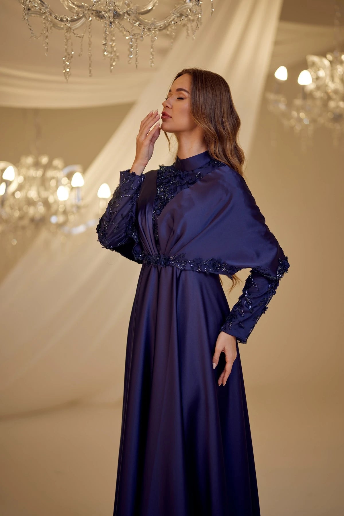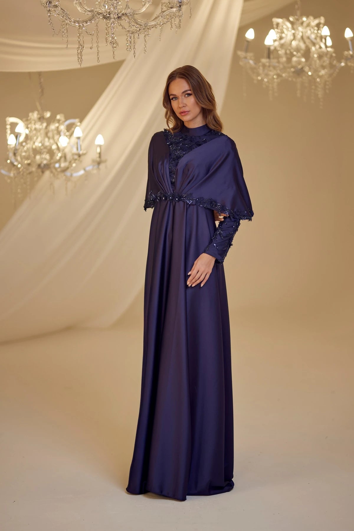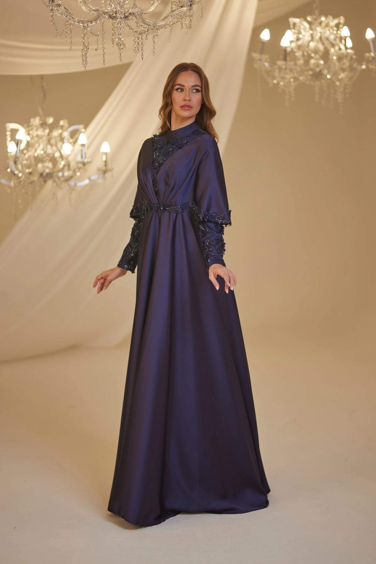 • Omuzlarından aşağıya doğru sarkan saten kumaştan yapılmış ve uçları ince dantel motiflerle süslenmiş gülşah abiye modelimiz arkadan gizli fermuarlı olup astarlıdır.