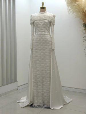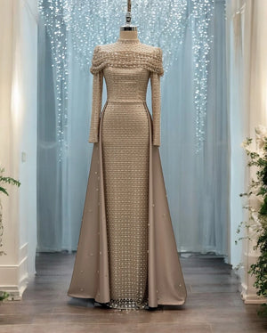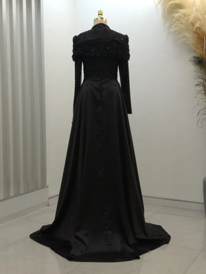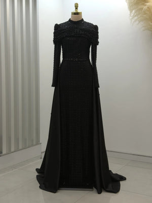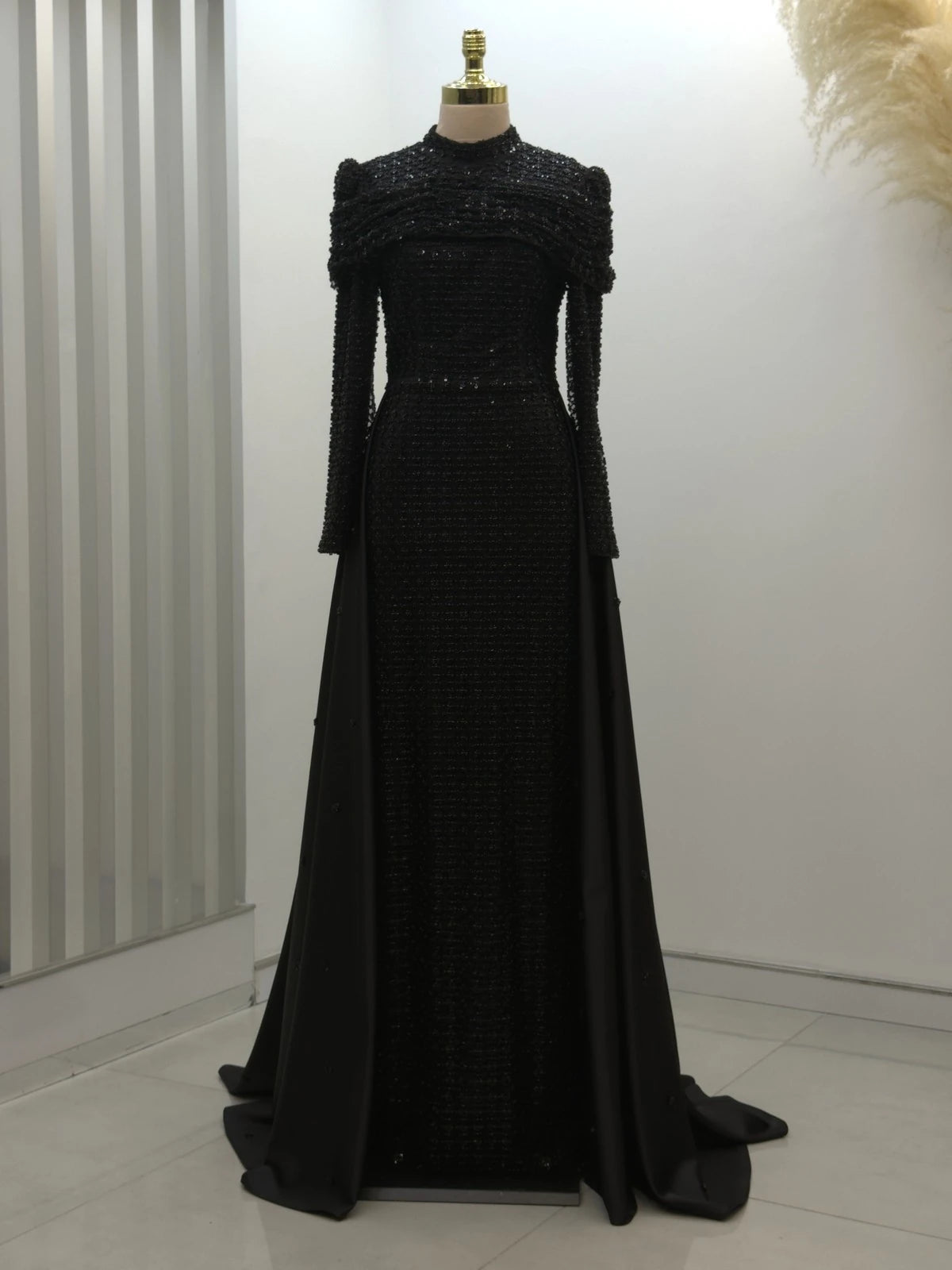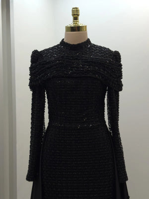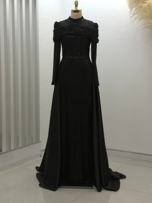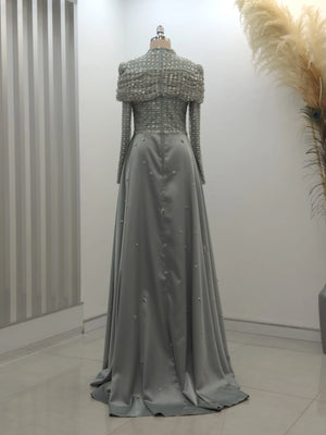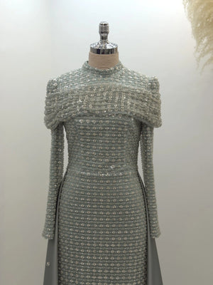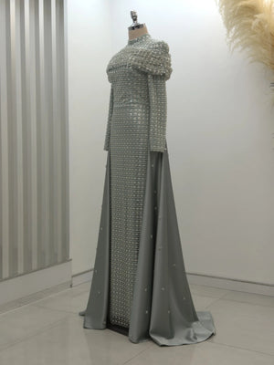 tamamı boncuk işlemeli omzu drape detay griselda abiye modelimiz pelerin kuyruğa sahip olup astarlıdır ve arkadan gizli fermuarlıdır.