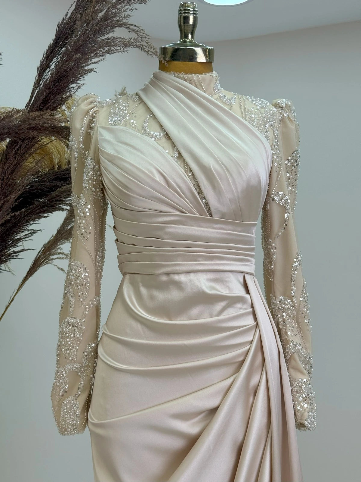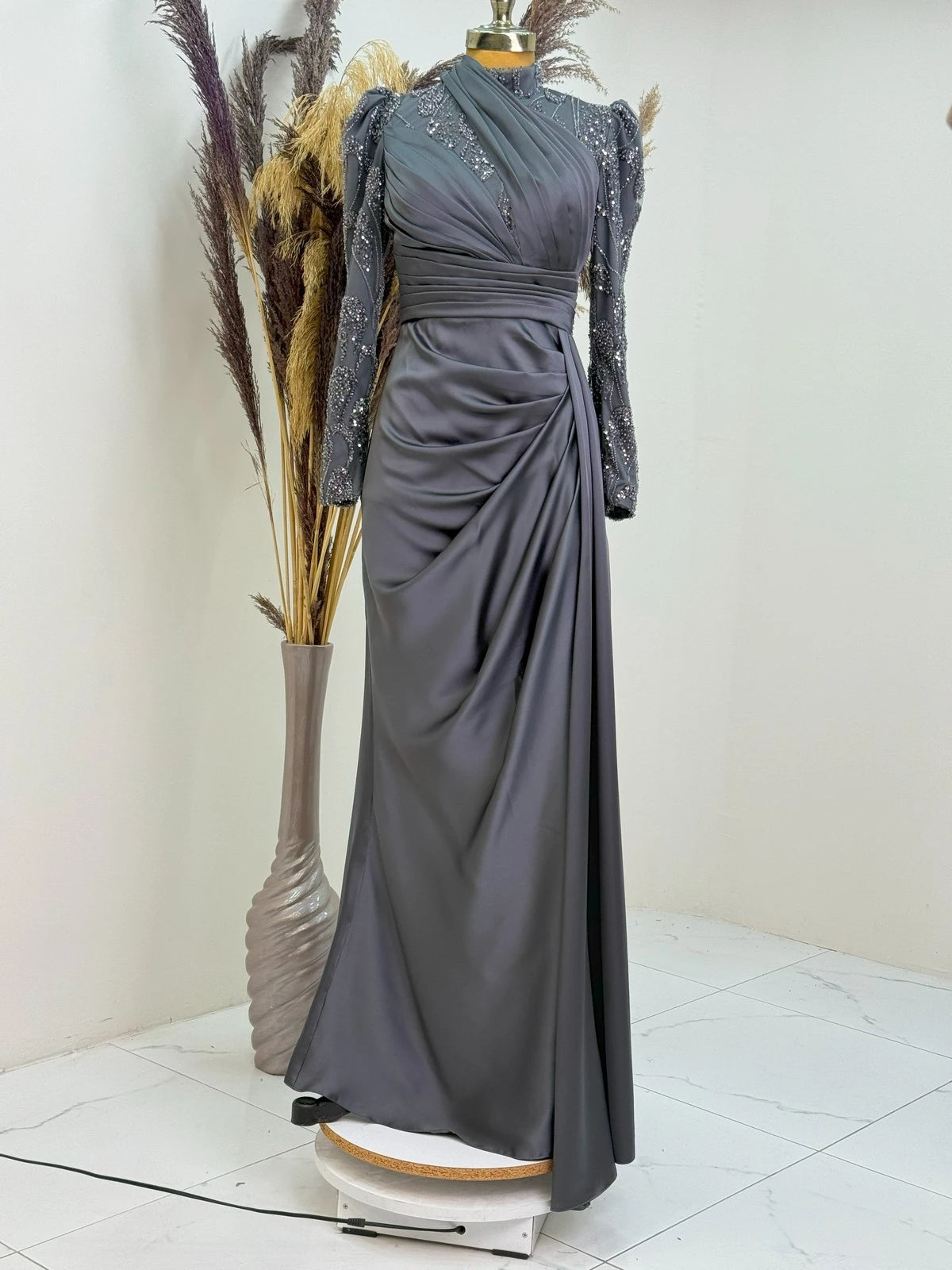Üst Kısmında Drape Detayları vardır Etek Kısmında Saten Kumaş Kullanılmıştır