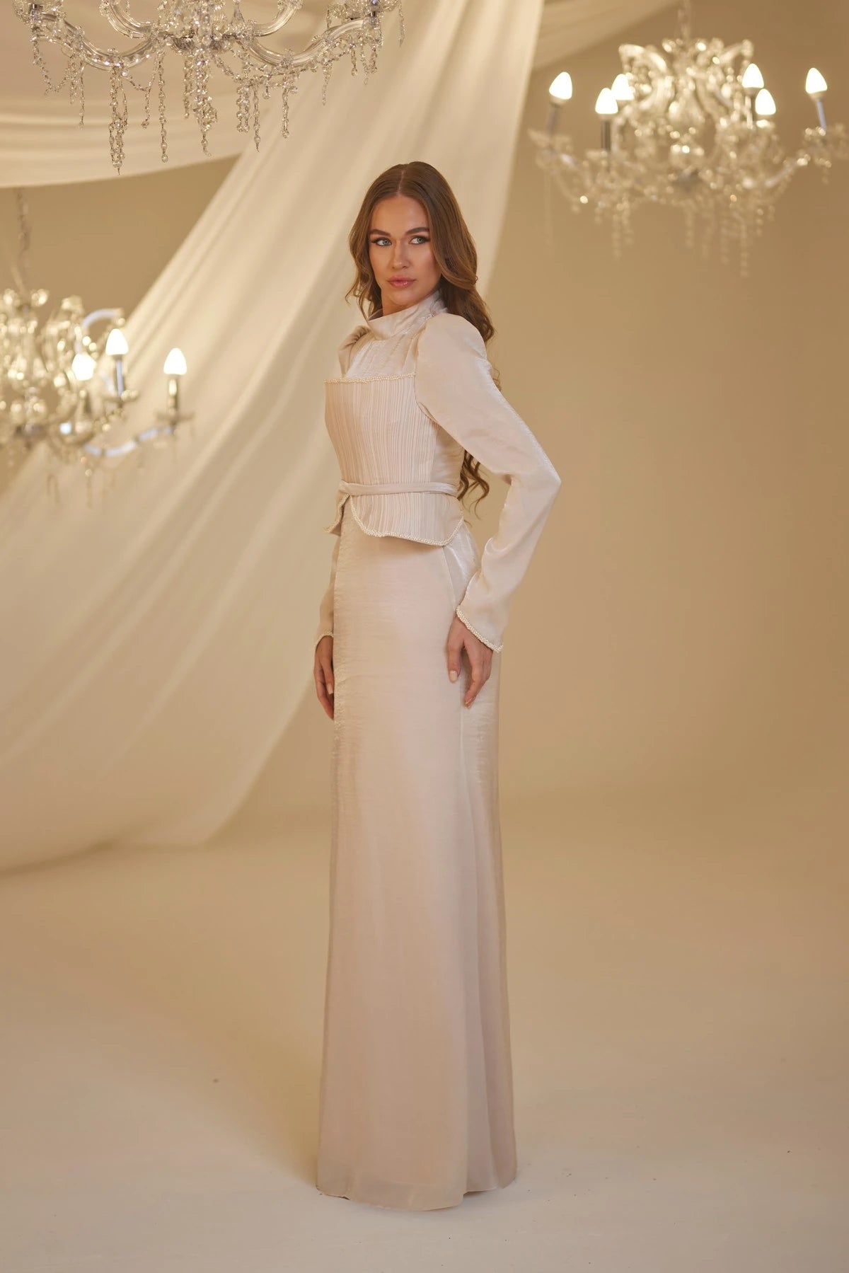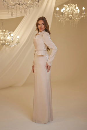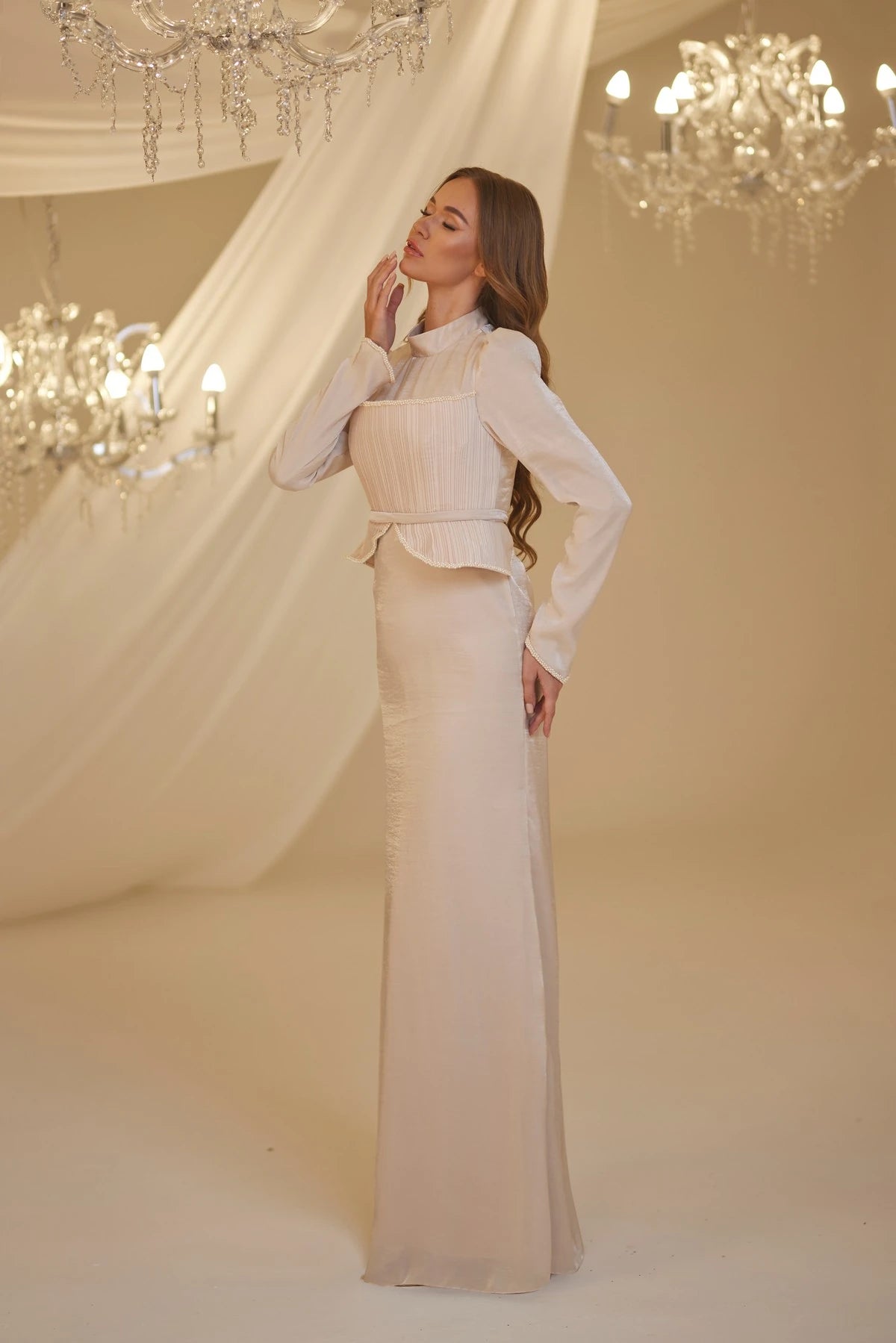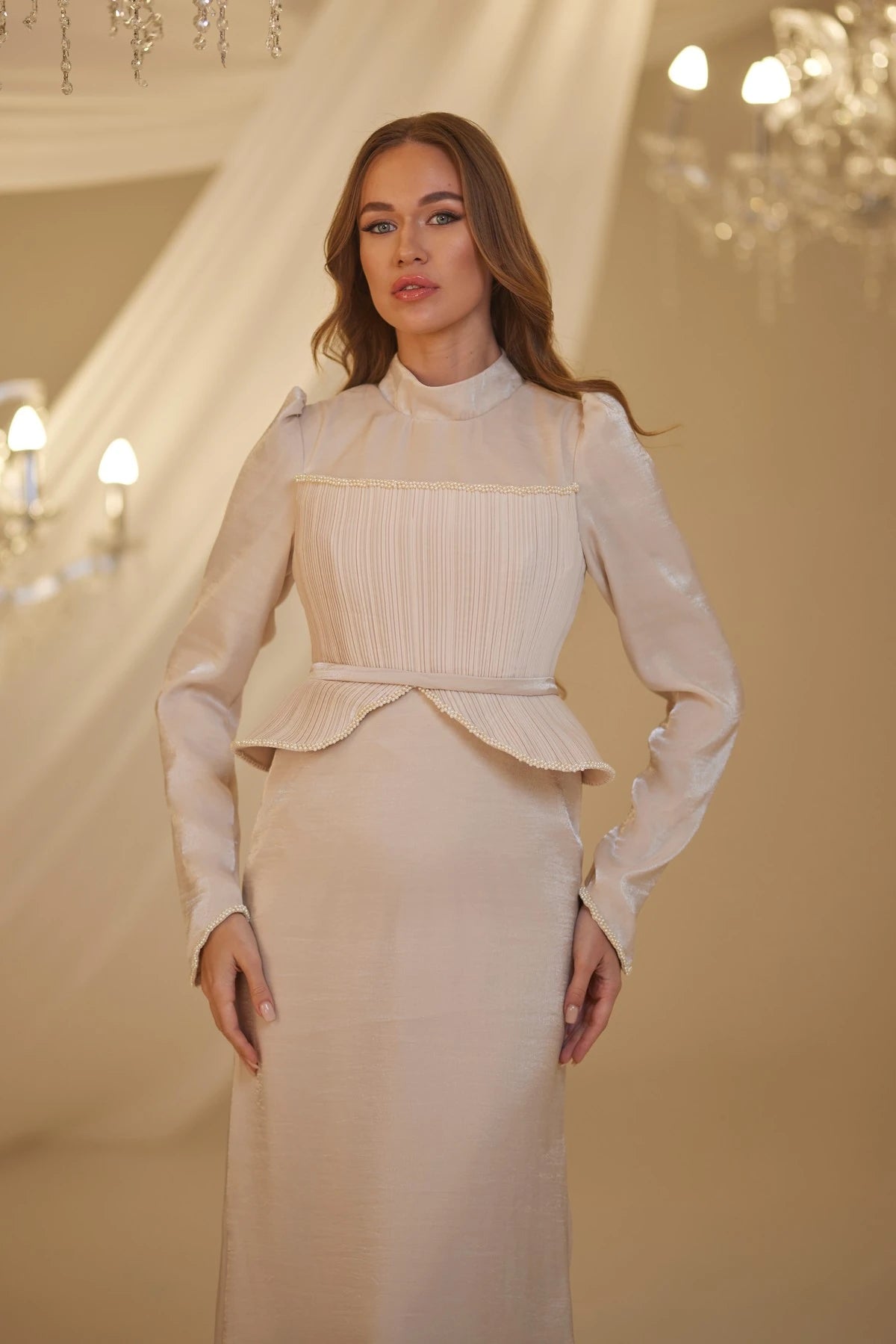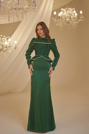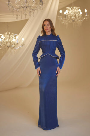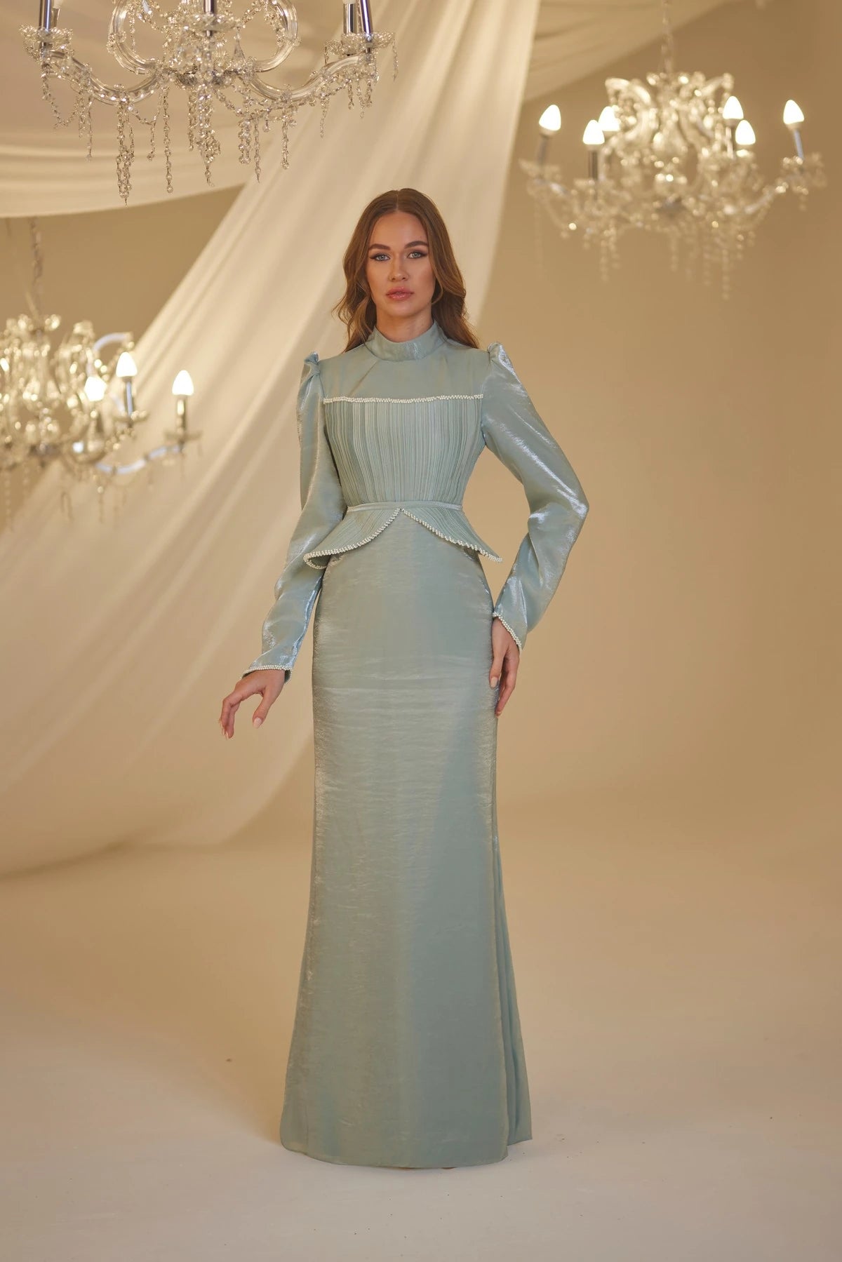 • Düz kalem etek tarzında ve belinde peplum detayı olup incilerle süslenmiş tafta kumaş olan efsun abiye modelimiz arkadan gizli fermuarlı olup astarlıdır.